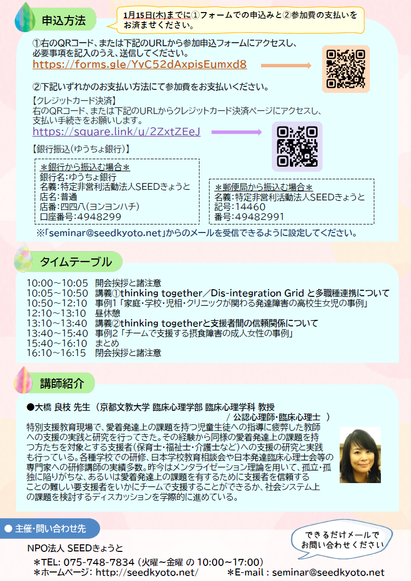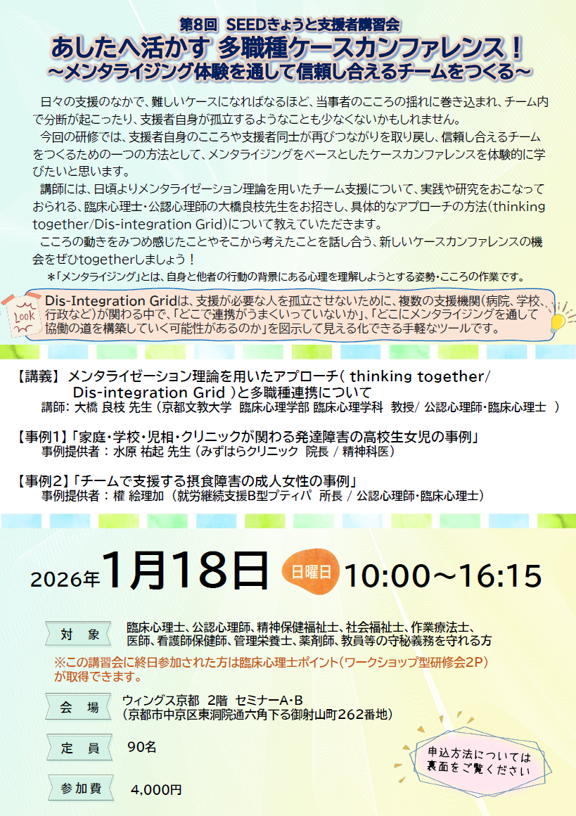 【問い合わせ先】NPO法人SEEDきょうと 支援者講習会担当